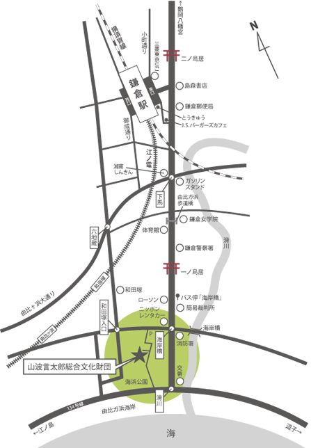 鎌倉駅東口を出て、若宮大路を右手に折れ海岸方向へ進みます。交差点「海岸橋」を右折。最初の路地を左折し、道なりに進んだ右側です。路地の入口の向かいには、鎌倉の景観重要建築物「篠田邸(旧村田邸)」があります。