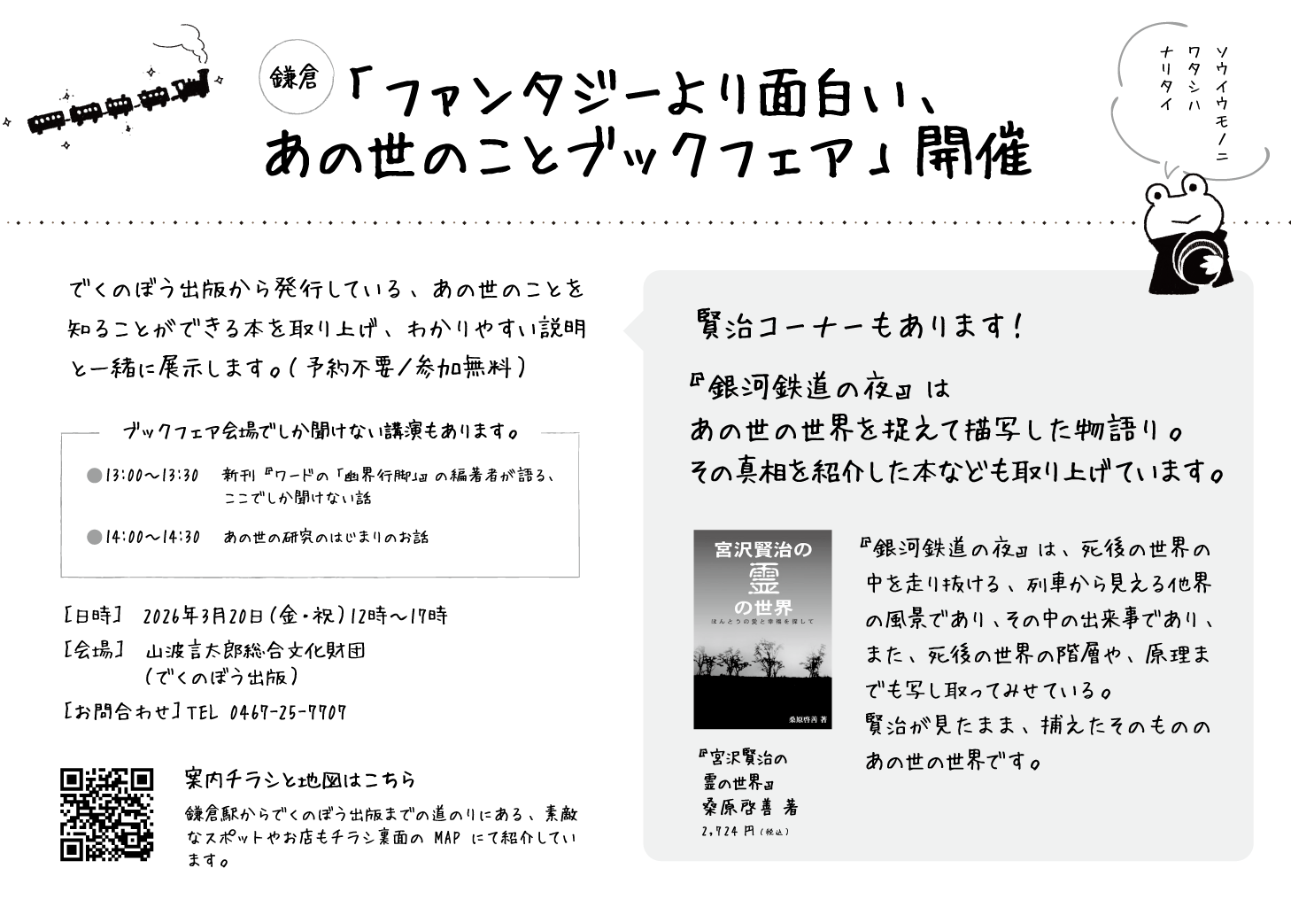 3/20(金・祝)開催の、「ファンタジーより面白い、あの世のことブックフェア」では、賢治コーナーもあります!